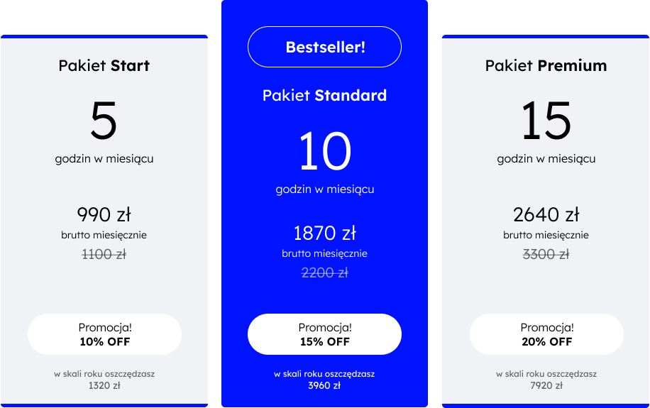 Zredukuj zbędne koszta utrzymania dodatkowych pracowników. Inwestycja, która się opłaca - płacisz tylko za nasz czas pracy, a nie za przerwy i urlopy!